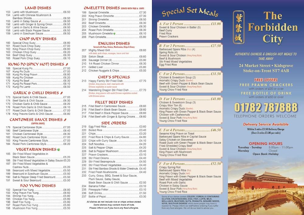 The Forbidden City is nestled at 24 Market St, Kidsgrove, Stoke-on-Trent ST7 4AB, easily accessible to locals and visitors alike. Open every bank holiday, the restaurant caters primarily to dinner crowds and has garnered attention for its consistent quality and prompt service. It features a casual dining atmosphere perfect for unwinding after a long day. The staff are known for their friendliness and willingness to help, setting this restaurant apart from others in the area. Parking is free on the street, making it easy to stop by for a meal without any hassle. With a wheelchair-accessible entrance and seating, everyone can enjoy a hearty meal without obstacles. This spot has become a beloved gem in the community, frequently buzzing with happy patrons and satisfied families. If you're in Kidsgrove looking for delicious Chinese cuisine, give The Forbidden City a try, whether it's for a quiet night out or a bustling gathering with friends.